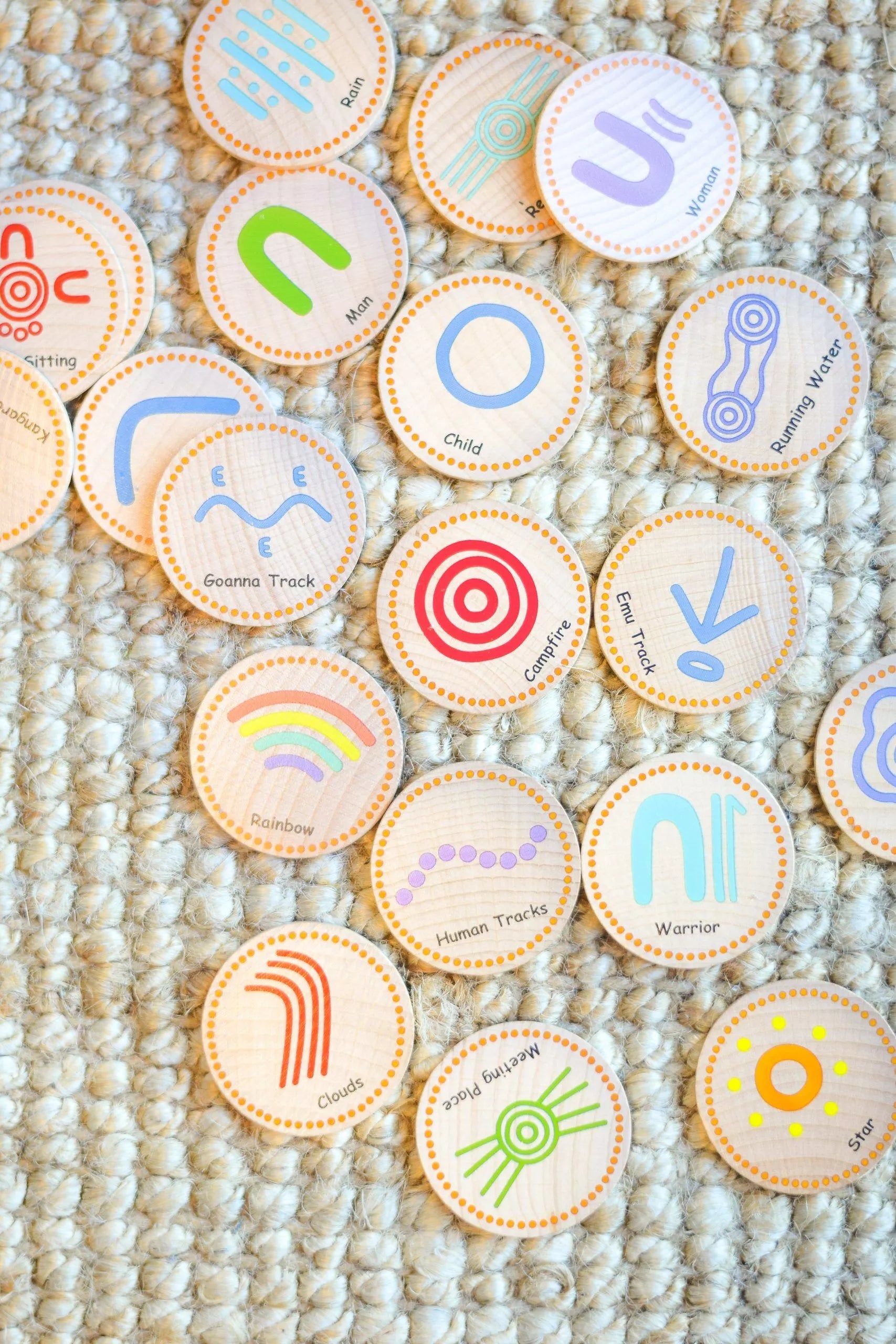 Designed in collaboration with award-winning Aboriginal artist De Greer-Yindimincarlie, each disc contains an Indigenous symbol such as meeting place, waterhole and rainbow just to name a few. These discs are a great toy to learn about the Indigenous culture, opening discussions around the traditional Australian landowners, as well as a fun game of matching pairs. A fun way to introduce Indigenous symbols while encouraging children to feel positive and confident while they learn through play.