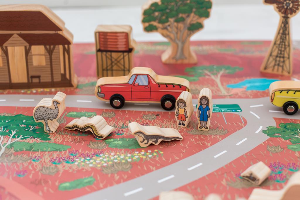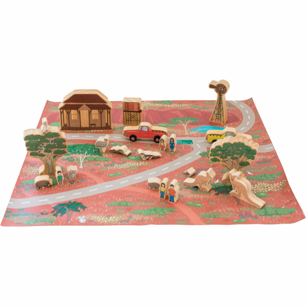 Take a trip to the Australian outback with this 23 piece small world set. This set includes an outback landscape natural rubber and microsuede mat, 22 wooden play pieces comprising a house, water tank, windmill, indigenous people, trees, cars, and some native Australian animals. It is a great playscape setup that encourages imaginative open-ended play while learning all about the Australian outback and promotes social development through role-playing. The beautifully illustrated images are printed using non-toxic heat transfer technology and sealed with a clear matte varnish to ensure they look as good as the day you buy them for years!