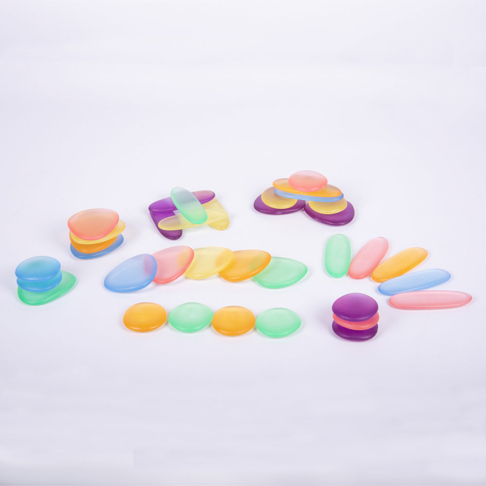 Set includes : 36 pebbles in jar (3 shapes, 6 translucent colors.)