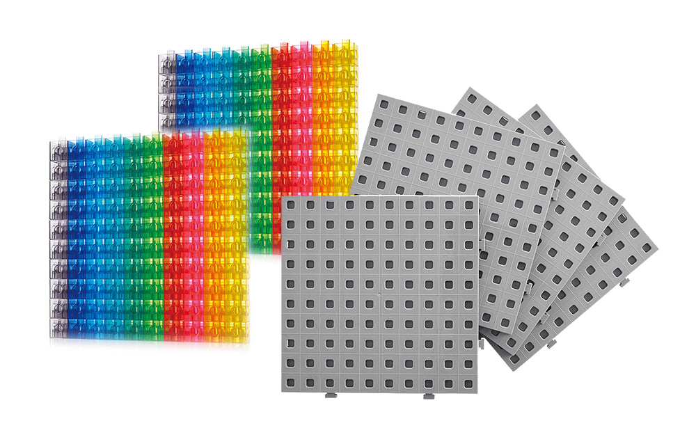 Set includes: 2 X Translucent 20mm linking cubes, 100 pcs in 10 colors, 4 Linking Cubes Baseboards