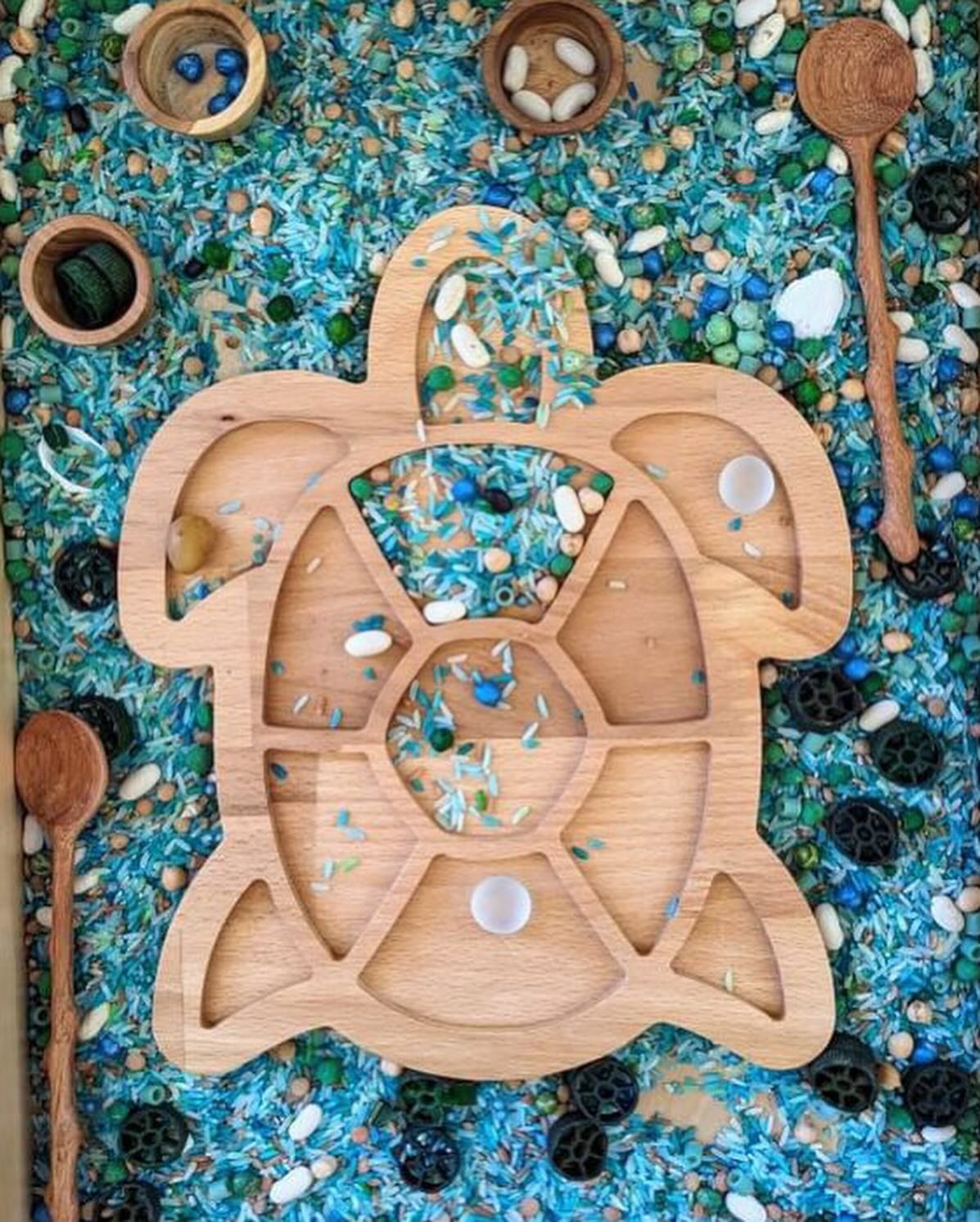 The wooden turtle sensory tray is created for opportunities of open ended play.