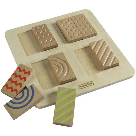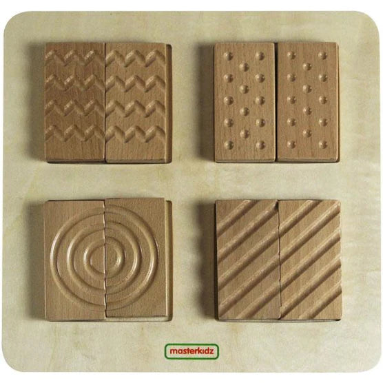 A handy tactile and visual skills training toys featuring 4 pairs of solid wood blocks.