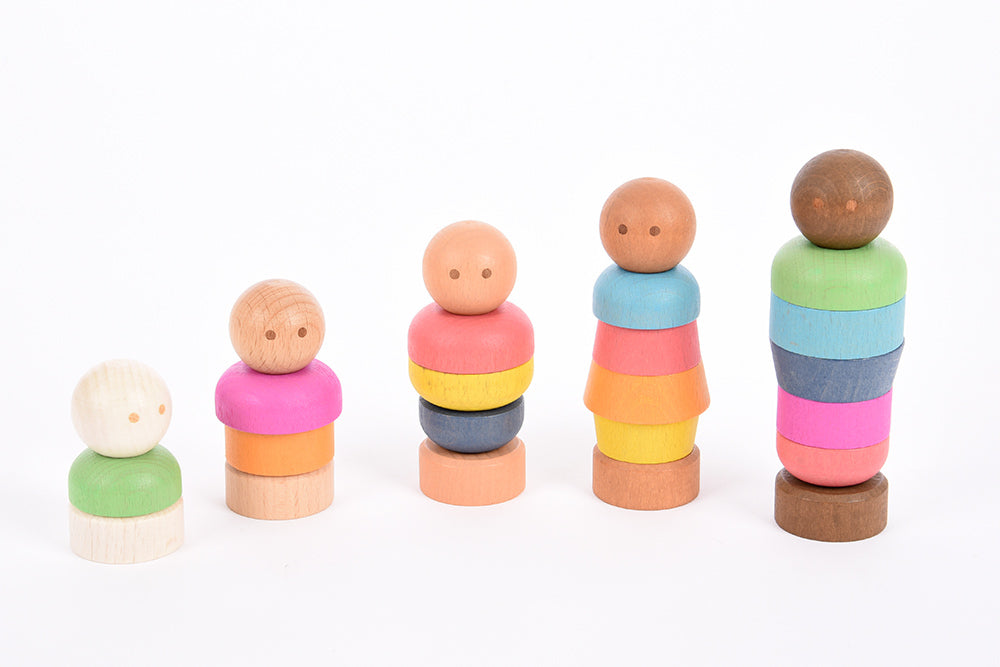 A diverse set of smooth beechwood people figures with different skin tones. The figures are made up of 5 different skin tone heads on threaded bodies, an additional 15 rainbow coloured slide-on cuffs, and 5 skin tone "feet" which screw on to secure the pieces in place. Children can mix and match the cuffs with the heads and feet, to create differently shaped and coloured bodies for their little community.