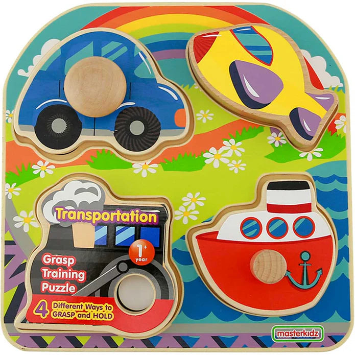 This oversized wooden Transportation Knob Puzzle features bright colours with easy grip extra thick pieces.