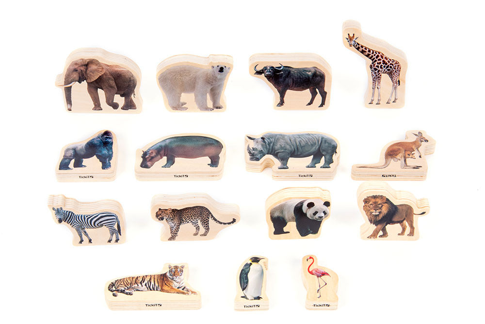 Chunky and lightweight birch plywood picture blocks, colour printed on both sides with real images of fifteen wild mammals and birds.
