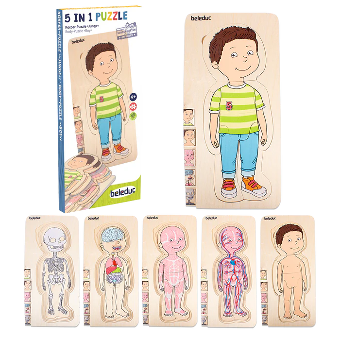 The puzzle shows the arrangement of the male/female body in a descriptive and child-friendly way from the skeleton to the organs and muscles, depicting the blood circulation - from the naked to the fully dressed child